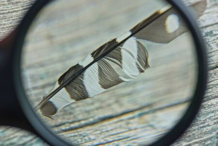 black magnifier magnifies the striped feather of a bird on a gray background