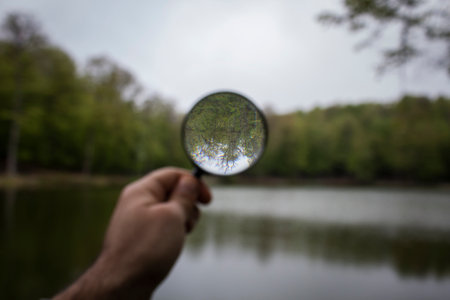 magnifying glass on the background of the lake and the forest
