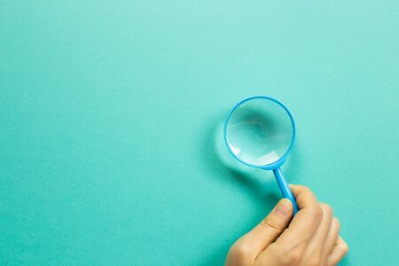 Hand holding a blue magnifying glass on green background. top view, copy space