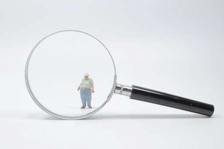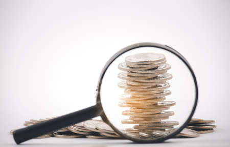 Coins stack close-up with magnifying glass on the white background, Money spending planning, and investment budget, Business saving money concept, Copy space