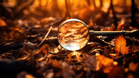 A magnifying glass reflects a blurred scene inviting closer inspection and discovery of hidden details.