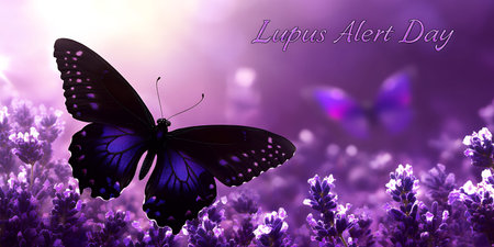 Purple butterfly on lavender flowers. Lupus Alert Day awareness image, promoting understanding and support for those affected by Lupus.