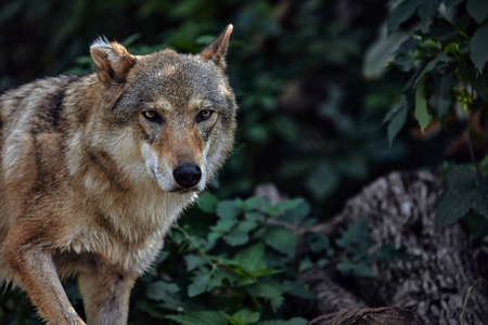 Portrait of a wolf in the forest. Wildlife scene from nature.