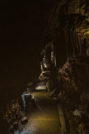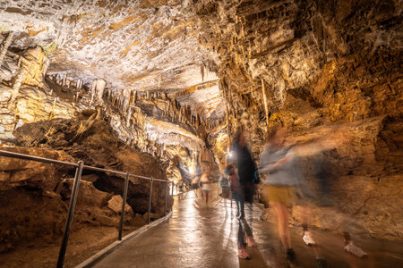 Tourists walking on a concrete footpath inside the famous Postojna cave in Slovenia, illuminated by artificial lights