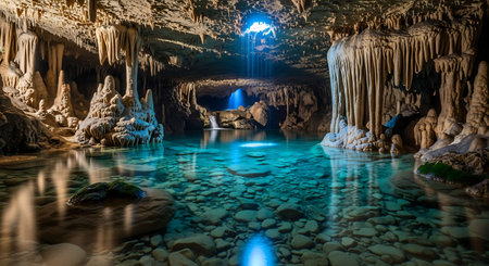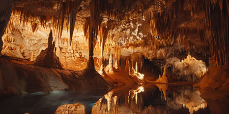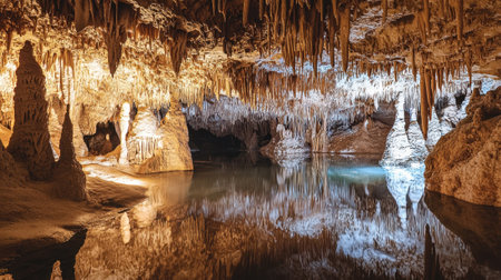 Exploring a breathtaking underground cave featuring impressive stalactites and stalagmites. A calm water body reflects the captivating cave formations in gentle light.