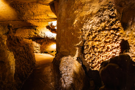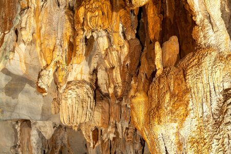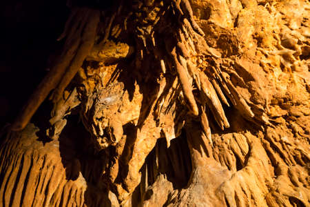 Underground rock formations in Remouchamps caves, cracked, rough and uneven walls due to erosion and water seepage, Aywaille, Belgium