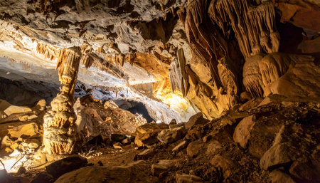Enormous rocks and geological features in an underground cave with stalactites and stalagmites, and mineral deposit pillars. No people, with copy space.