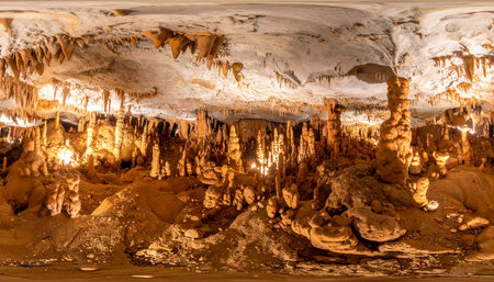 Step into a hidden world beneath the Earths surface. This breathtaking 360-degree panorama reveals an ancient cavern, where millennia of dripping water have sculpted a spectacular forest of stalactites and stalagmites. Bathed in warm light, the intricate formations create a scene of timeless wonder and geological artistry, inviting exploration and discovery.