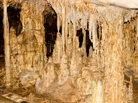 Stalactites and stalagmites in Cave Koutouki at Peania. The cave is located on the east side of Ymittos mountain, above the city of Peania.
