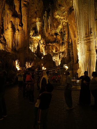 Visitors marvel at the intricate rock formations in a cave in Malaga, Spain. As evening falls, soft light illuminates the unique textures, creating a magical atmosphere in the underground sanctuary.