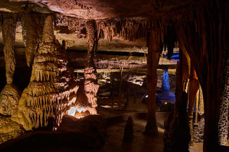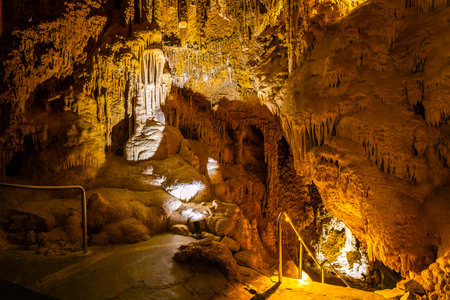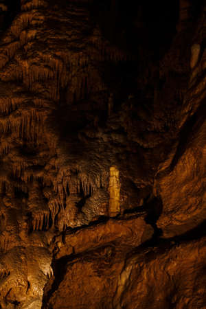 Illuminated picturesque karst rock formations in Balcarka Cave, Moravian Karst, Czech: Moravsky Kras, Czech Republic.