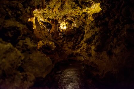 Xaghra, Gozo, Malta - September 3, 2019: Dim light in the middle of Xerri's Grotto deeply underground. It is a cave discovered by local man while digging a well under his house. Now open to public.