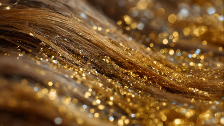 Close-up of golden hair adorned with shimmering glitter, creating a luxurious and festive look. Beauty and glamour concept.