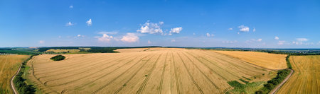 Aerial landscape view of yellow cultivated agricultural field with ripe wheat on bright summer day