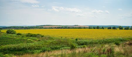 Panoramic view of a blooming sunflower field. Agricultural grounds.