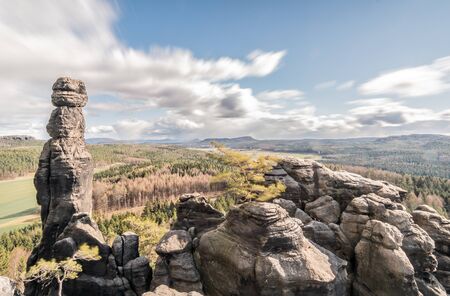 Herald's viewpoint, Autumn sandstone landscape of Bohemian Paradise in sunny day, winter at rock formation Drabske svetnicky, pine branches, Hiking Golden Trail of Bohemian Paradise, Czech Republic