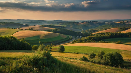 Wide view of fields and meadows in summer.