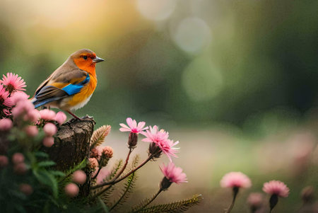 A small, colorful bird perched on a branch with pink flowers in the background. The bird has orange, blue, and yellow feathers.