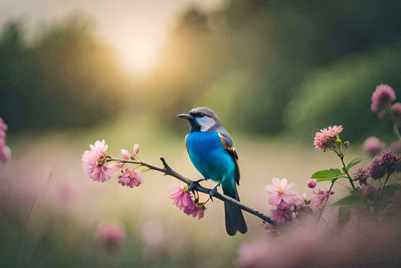 A vivid blue bird perches delicately on a branch adorned with soft pink blossoms, bathed in the warm glow of a setting sun.