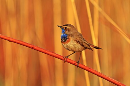 Bluethroat - Cyanecula svecica, beautiful colored shy perching bird from European reeds and fresh water shores, Morava river, Czech Republic.
