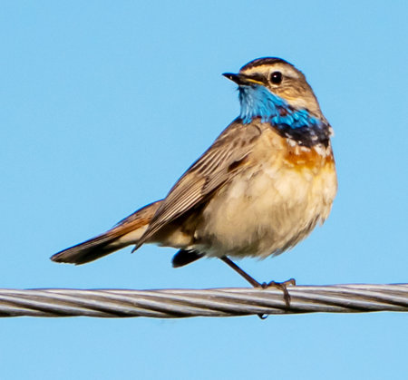 Male bluethroat shows off its vivid throat patch while singing from a reed. A charming songbird of wetlands, admired for its colorful plumage and melodic voice.