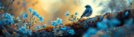 Tranquil bluebird perching on delicate branches at twilight, surrounded by serene natural light and bokeh, in a peaceful wildlife habitat at dusk