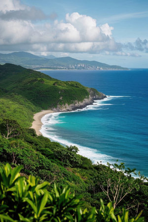 Stunning aerial view captures the serene beauty of a tropical coastline, featuring lush green forests meeting vibrant blue ocean waters, showcasing nature's harmony.