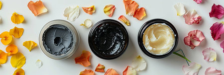 Three jars of natural face masks and creams surrounded by flower petals on a white surface.