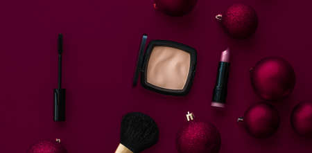 Cosmetic branding, fashion blog cover and girly glamour concept - Make-up and cosmetics product set for beauty brand Christmas sale promotion, luxury burgundy flatlay background as holiday design
