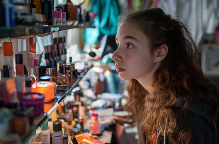 A young girl sits in her room surrounded by an extensive collection of beauty products, reflecting the vast choices available in modern cosmetics