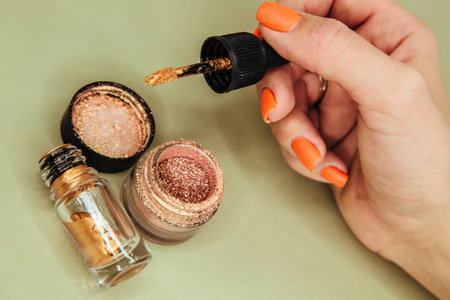 A persons hand holding a spoon in a jar of glitter, with flowers and powders on a black surface in front of them. Generative Ai
