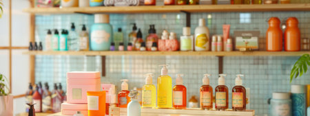 A brightly lit retail shelf displaying a variety of skincare and beauty products in a modern store setting. The arrangement showcases colorful bottles, jars, and boxes, ideal for retail, beauty product promotions, and store display concepts.