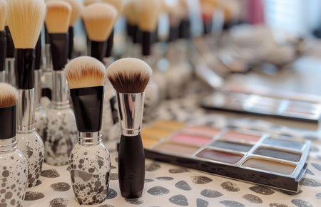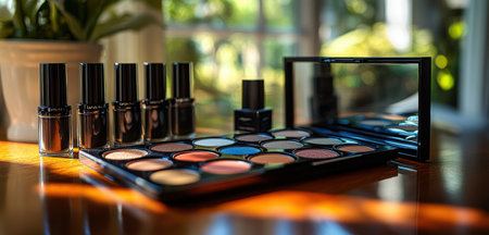 A stylish table displays various makeup products, including brushes, eyeshadow palettes, and lipsticks. Natural light enhances the beauty of these cosmetic items, inviting creativity.