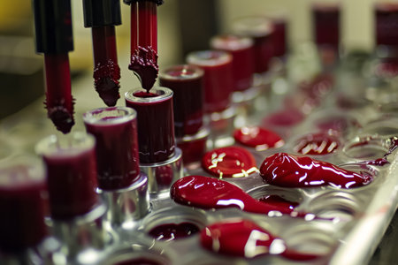 Precision robot applying color to lipstick in a cosmetic manufacturing process. Industrial makeup production equipment in operation. Beauty industry and technology concept. Design for print and banner.