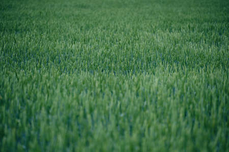 Close up spring green grass. Beautiful landscape with grain and cornfield.