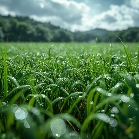 Captured at sunrise, this image showcases morning dew clinging to fresh green grass, illuminated by soft sunlight, creating a serene and vibrant outdoor atmosphere.