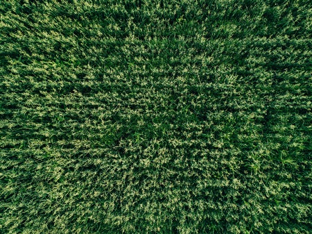 Aerial view drone shot Close-up of deep green wheat ears on field, top view. Backdrop of ripening ears of yellow wheat field. High quality photo