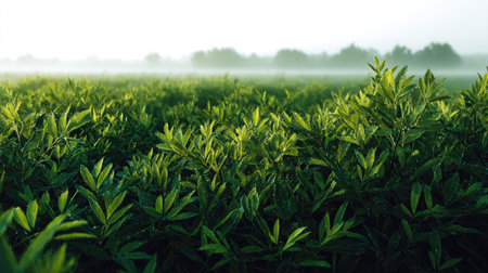 Vibrant view of a tea plantation under soft light, highlighting the manicured rows of green tea leaves across gentle hills. Perfect representation of tranquility and rural agriculture.