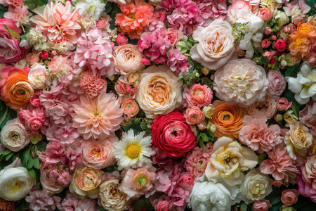 A vivid assortment of various flowers including roses, chrysanthemums, daisies, and hydrangeas creating a beautiful, colorful floral pattern. ideal for botanical art prints, greeting cards, and posters, this arrangement embodies the essence of nature s beauty. Generative AI