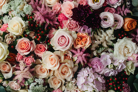 Colorful flower bouquet forming a floral background with roses, dahlias, sunflowers and hydrangeas