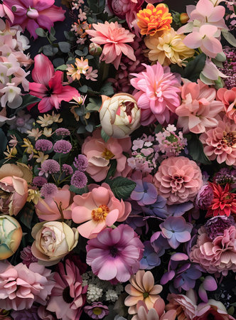 Beautiful arrangement of colorful flowers including peonies and dahlias on a dark background, showcasing a vibrant floral composition perfect for decoration.