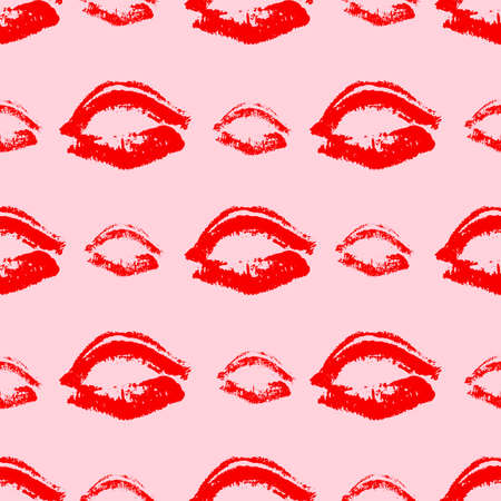 Seamless pattern red lipstick kiss on pink background. Lips prints vector illustration. Perfect for Valentines day postcard, greeting card, textile design, wrapping paper, etc.