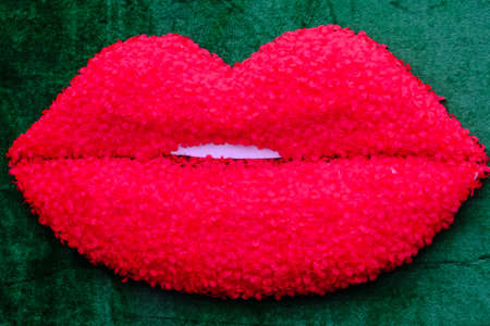 Valentines Day background with Mouth-shaped flowers of love on the background green grass.