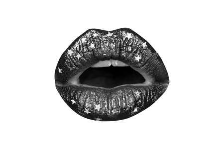Sexy fashion model with shiny sparkles on lips sending air kiss to camera. Macro view of woman with glamorous make-up. Nightlife, night club concept.