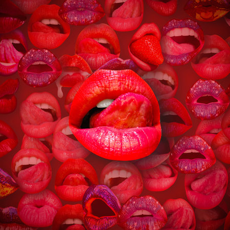 Backgroun of female lips. Collection of female mouth with red lip. Texture pattern with mouth on red backdrop.