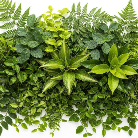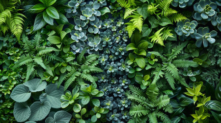 A vibrant display of lush green leaves and plants creates a stunning wall of natural textures. Ideal for wellness, interior decor, or botanical themes.