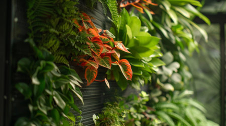 Green living wall with tropical plants and red flowers