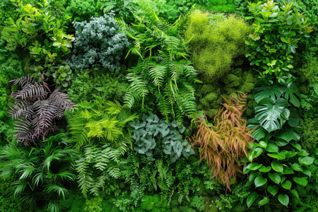 Plant wall with lush green colors, variety plant forest garden on walls orchids various fern leaves jungle palm and flower decorate in the garden rainforest background
