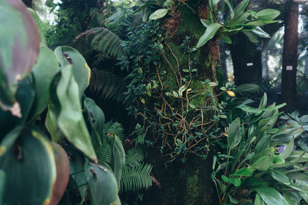 A junglelike greenhouse with tall palms wideleafed plants and hanging vines