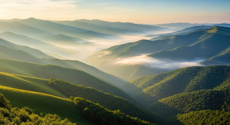 Captivating view of a serene mountain landscape features rolling hills and misty valleys. The gentle glow of sunrise enhances the beauty of lush green forests.